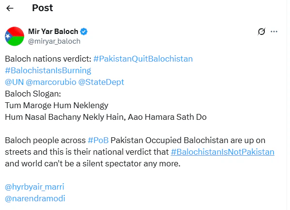 ભારત સહિત વૈશ્વિક સમુદાય પાસેથી સમર્થન માંગ્યું, મીર યાર બલોચે સોશિયલ મીડિયા પ્લેટફોર્મ X પર ભાવનાત્મક અપીલમાં લખ્યું કે દુનિયા હવે મૂક પ્રેક્ષક બનીને રહી શકે નહીં.